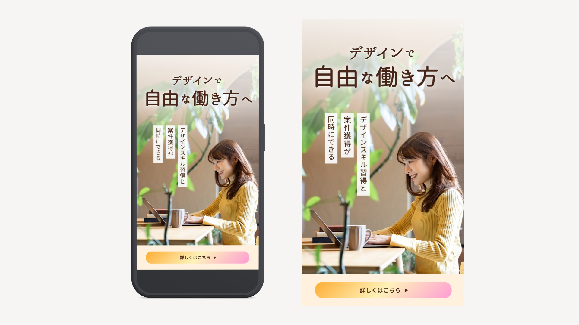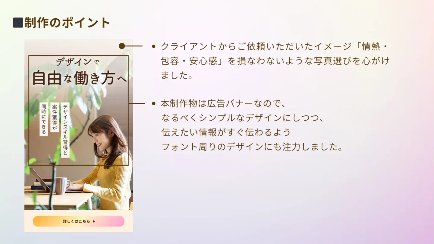 クライアントからご依頼いただいたイメージ「情熱・包容・安心感」を損なわないような写真選びを心がけました。また、本制作物は広告バナーなので、なるべくシンプルなデザインにしつつ、伝えたい情報がすぐ伝わるようフォント周りのデザインにも注力しました。